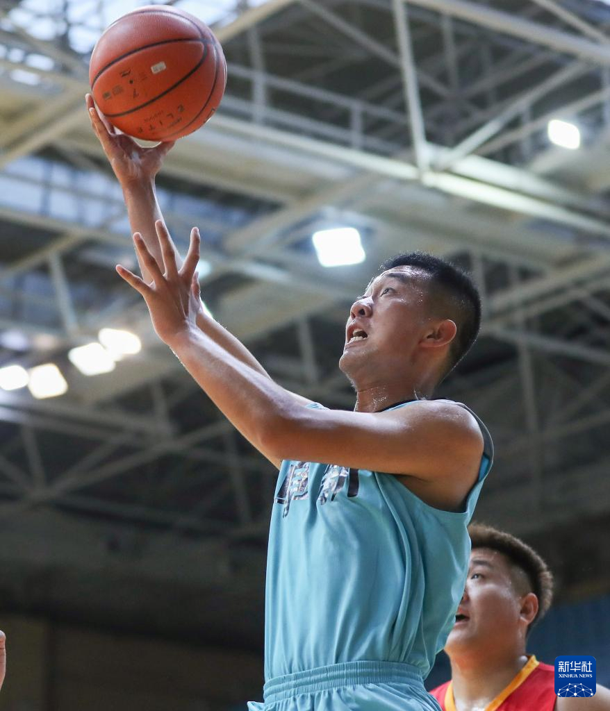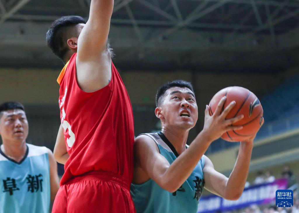 8月8日,彰武县苇子沟镇队球员于纯石(右)在开幕式的篮球表演赛中上篮。新华社记者 龙雷 摄pagebreak