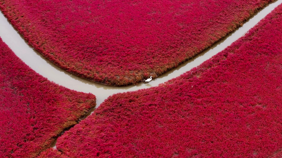 云瞰盘锦红海滩:一望无际的“红色海洋”